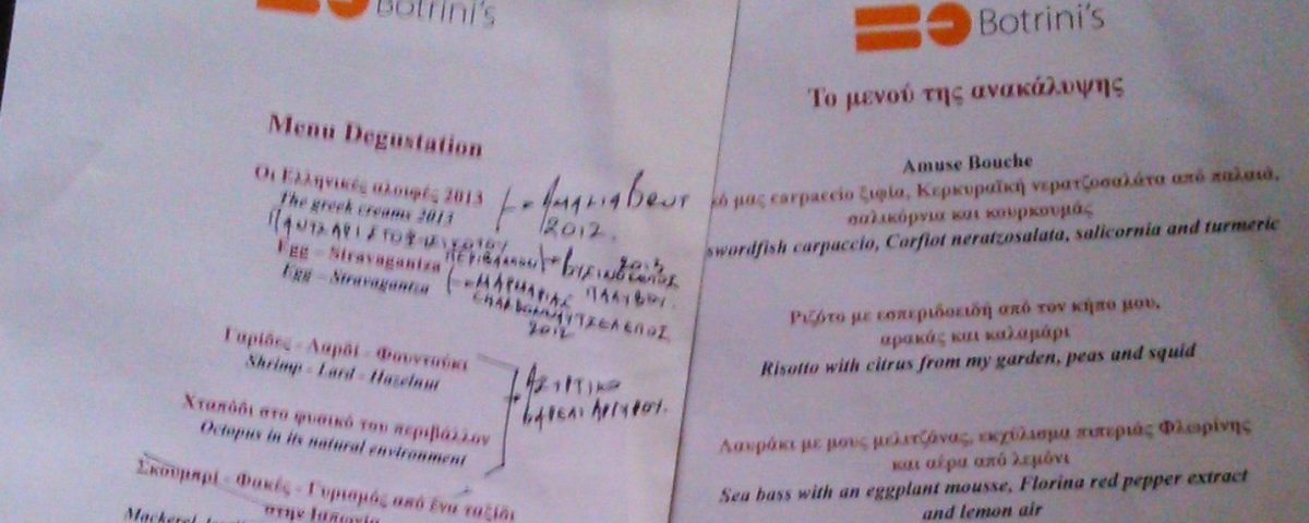 Παρασκευή 4 Ιανουαρίου 2014 επισκέφθηκα το βράδυ το εστιατόριο Botrini’s για να δοκιμάσω τη κουζίνα του. Το εστιατόριο βρίσκεται στο Χαλάνδρι σε μια περιοχή που είναι κοντά στο εμπορικό κέντρο του και ταυτόχρονα αρκετά μακριά από αυτό ώστε να κινηθείς με την ησυχία σου. Τραπέζια καθαρά και περιποιημένα, καρέκλες αναπαυτικές, φωτισμός άφθονος και εστιασμένος πάνω από το κάθε τραπέζι ώστε να βλέπεις τι τρως, μουσική διακριτική που δεν ενοχλούσε. Η κουζίνα πίσω από τζαμαρία για να έχουν επαφή οι πελάτες με τα δρώμενα. Βέβαια αυτό κρύβει παγίδες για το εστιατόριο, διότι πρέπει, ακόμα και αν δεν έχουν κάτι να κάνουν οι μάγειρες, να δείχνουν συνεχώς απασχολημένοι. Επίσης με αυτόν τον τρόπο μπορείς να δεις αν ο patron chef είναι στο εστιατόριο του και ασχολείται με αυτό. Εγώ διάλεξα το menu degustation και η γυναίκα μου το μενού της ανακάλυψης. Η ροή των πιάτων ήταν αρκετά καλή, αλλά δυστυχώς δεν κατάφεραν να συγχρονίσουν σωστά τα δύο μενού, όπου το ένα είχε 4 πιάτα και το άλλο 9. Θα μπορούσε ίσως να γίνει λίγο καλύτερα διότι έφεραν τα δύο πρώτα πιάτα του καθενός μας ταυτόχρονα, ενώ τα επόμενα τρια που αφορούσαν εμένα τα έφεραν και η γυναίκα μου καθόταν και περίμενε, βλέποντας εμένα να τρώω. Εδώ θα μπορούσε να υπάρχει αναμονή πιάτων ανά ένα όπως θα εξηγήσω πιο κάτω. Ο συνολικός χρόνος εστίασης δεν πέρασε τις 3 ώρες.
