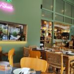 Τεράστιος χώρος με τραπέζια απλωμένα, άνετες καρέκλες, πολύ ωραία θέα, σωστός φωτισμός, καθαρές και προσεγμένες τουαλέτες.